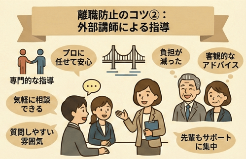 - ②先輩や上司への安心感を確保するために外部講師に指導を依頼する
