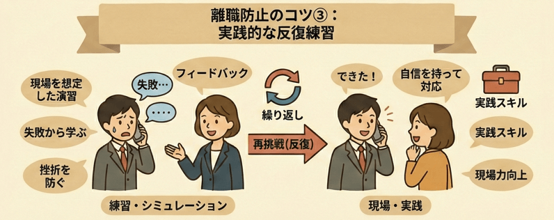 | 離職防止につながる理由 | 現場で失敗が続くと「自分は向いていない」と感じ、離職を考えやすくなります。 研修内で成功体験を積ませることで、失敗への耐性と自信を保てます。 |