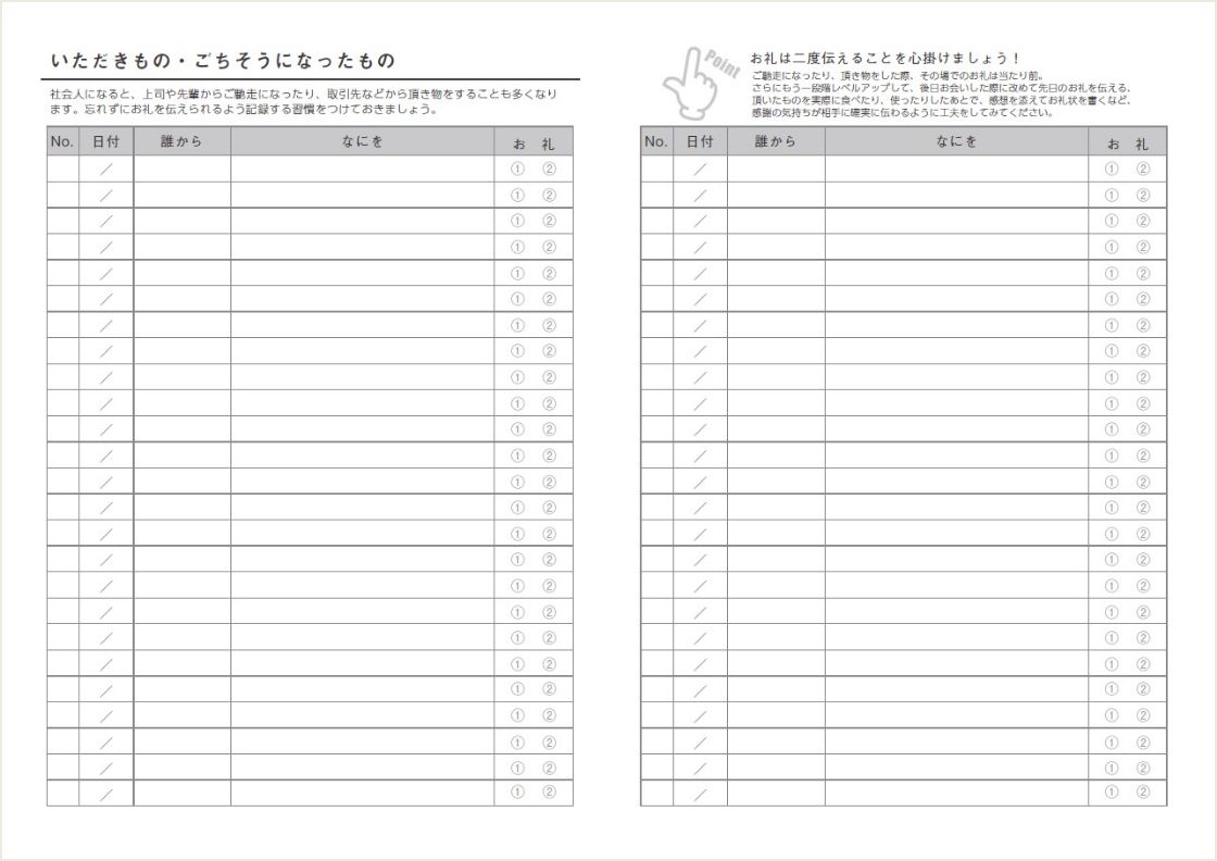 感謝の心を忘れずに。些細なことも当たり前と思わずに、感謝の心を忘れないでください。ビジネスの基本は「人と人」。人とのつながりを大切にする取り組みの重要性は早く知っておくにこしたことはありません。新入社員手帳には、いただきものリストもついています。